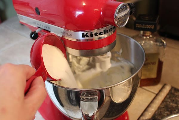 Stir in 2 tablespoons (30 g) of melted butter, 1 tablespoon (15 ml) of Amaretto, and 3/4 teaspoon (3.7 ml) of almond extract. Pour the batter into the prepared springform pan.