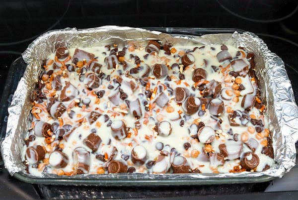 Layer the remaining ingredients over the partially baked base in this order: Rolo Minis, crushed pretzels, caramel bits, chocolate chips, and halved caramel kisses.